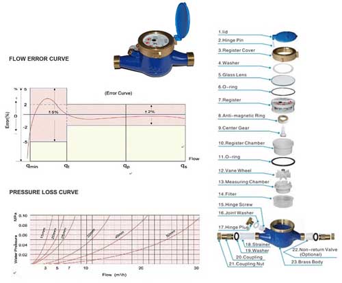 Khi lưu chất ( chủ yếu là nước ) tạo ra 1 lực đủ lớn để cánh quạt chính tâm đồng hồ quay. Cánh quạt này được liên kết với hệ thống bánh răng bên trong đồng hồ. Khi lượng quay đủ để nhảy số thì chúng ta sẽ có kết quả như ý muốn. Số nhỏ nhất là 1 khối tương đương 1000l.