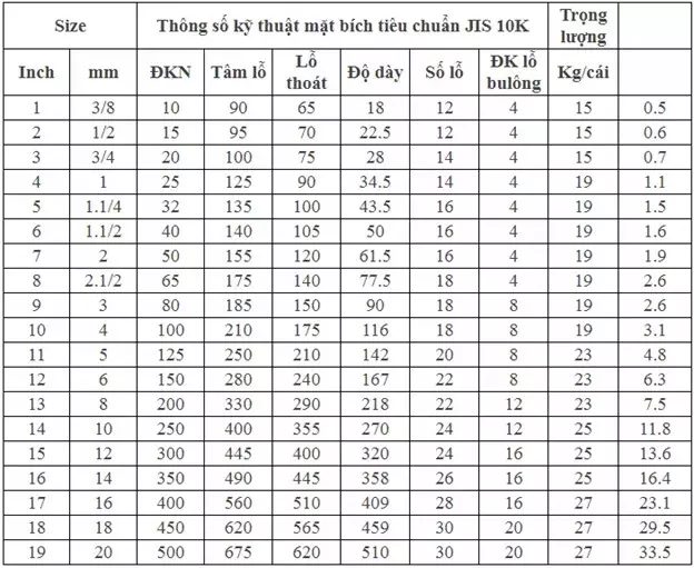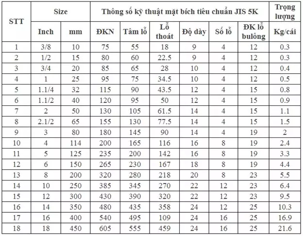- Kích thước kỹ thuật theo tiêu chuẩn mặt bích JIS 5K