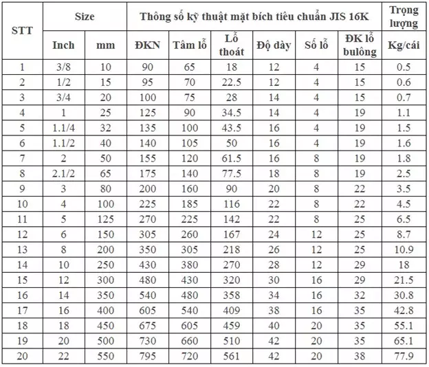 - Kích thước tiêu chuẩn mặt bích JIS 16K