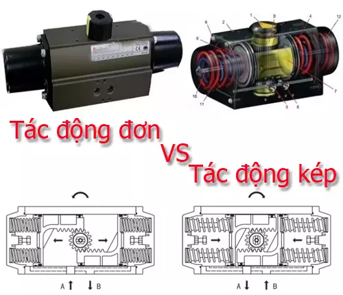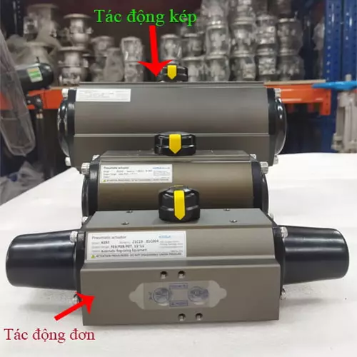 - Đối với dạng tác động kép thì nó sẽ tác động kép cần cấp khí nén mới có thể đưa được piston quay về vị trí ban đầu để đóng van.