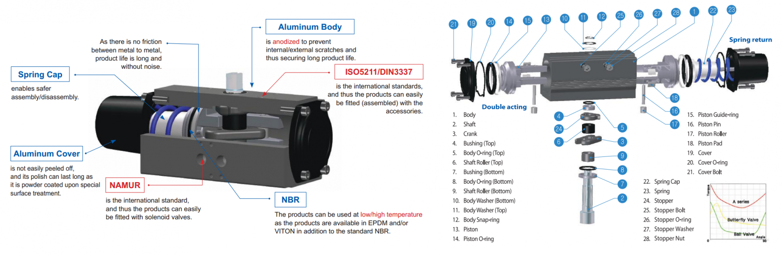 Để bộ điều khiển khí nén hoạt động, hệ thống máy nén khí sẽ cấp khí nén vào bên trong, dưới áp suất của khí nén, các piston chuyển động, thông qua hệ thống truyền động là các khớp bánh răng, tạo thành momen xoắn tại vị trí được thiết kế là đầu ra của Bộ điều khiển khí nén, cũng là nơi tiếp xúc-truyền lực với van đó là trục van, và van bắt đầu thực hiện hành trình đóng/mở. Mỗi loại van(van bướm, van bi..), kích cỡ van sẽ cần một lực đóng/mở khác nhau. Lực đóng/mở này phụ thuộc vào độ lớn của piston được lắp trong bộ điều khiển khí nén, piston càng lớn thì lực sinh ra càng cao. Van bi – do có cấu tạo đặc thù nên cần có lực kéo lớn hơn van bướm khá nhiều(so sanh với cùng kích cỡ)